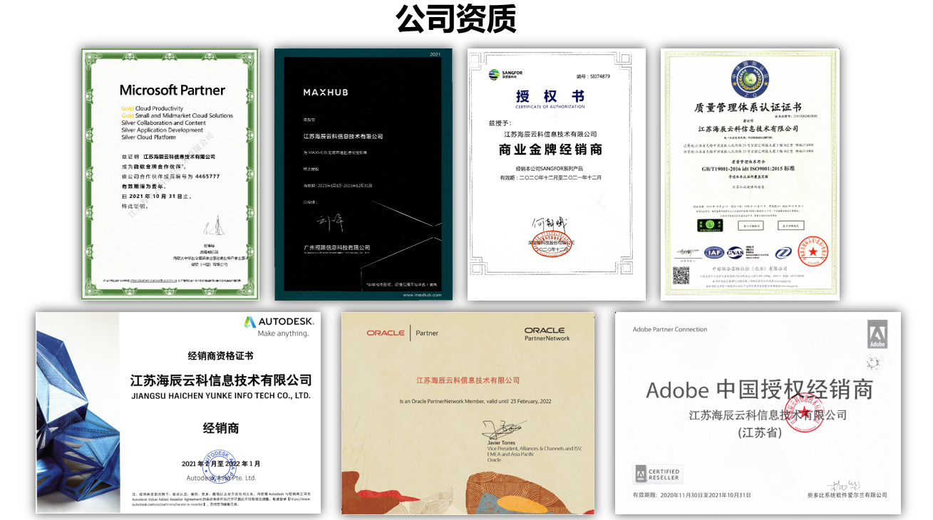 公司主要資質(zhì)有:微軟金牌資質(zhì)代理商,Oracle金牌資質(zhì)代理商,Adobe江蘇區(qū)域代理商,Autodesk(AutoCAD)江蘇區(qū)域代理商,深信服金牌資質(zhì)代理商,IP-guard金牌資質(zhì),奇安信金牌資質(zhì)代理商,MAXHUB江蘇區(qū)域代理商等。